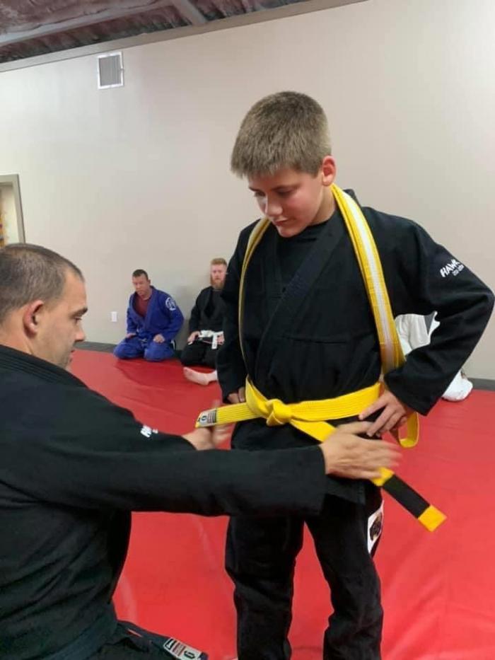 I received my yellow belt on July 31st 2020 but I have since received my first stripe.