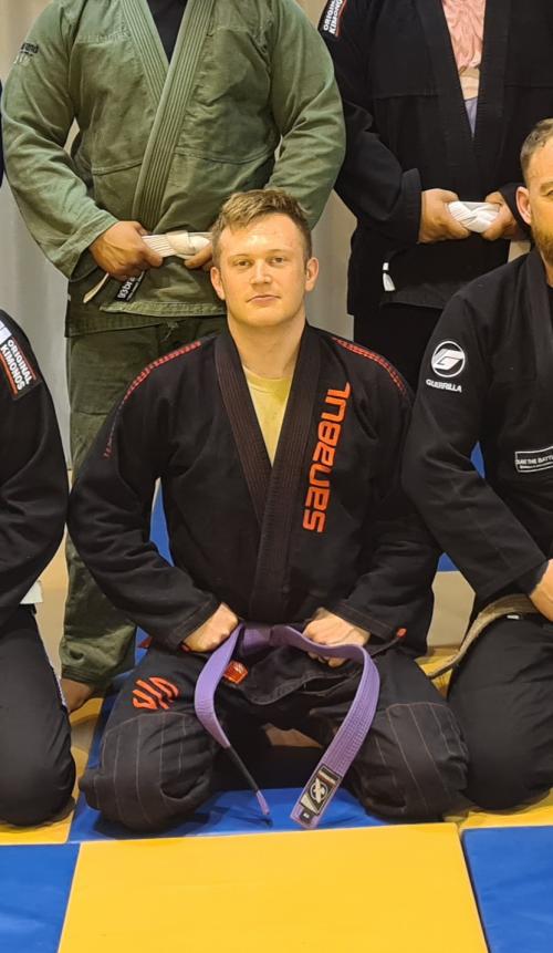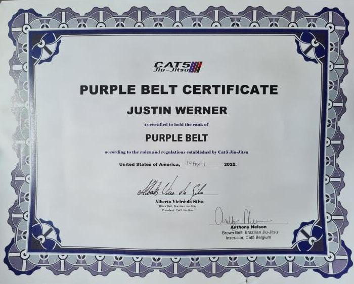 Purple belt under Blackbelt Alberto da Silva, & Brownbelt Anthony Nelson (Cat5 Jiu-jitsu Belgium)