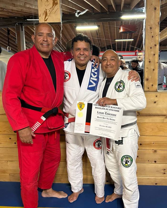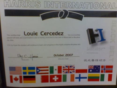 "Oct 2007 BB has good evidence with diplomas and I see together-with-pics with Roy Harris and Joe Moreira. Also, there's https://www.bjjheroes.com/bjj-fighters/louie-cercedez as source. Fourth degree is three years early, but no longer makes a difference, so as long as no further degree is claimed before it's time (based on the standard stripe intervals accepted by the wider community), I'll let that pass."