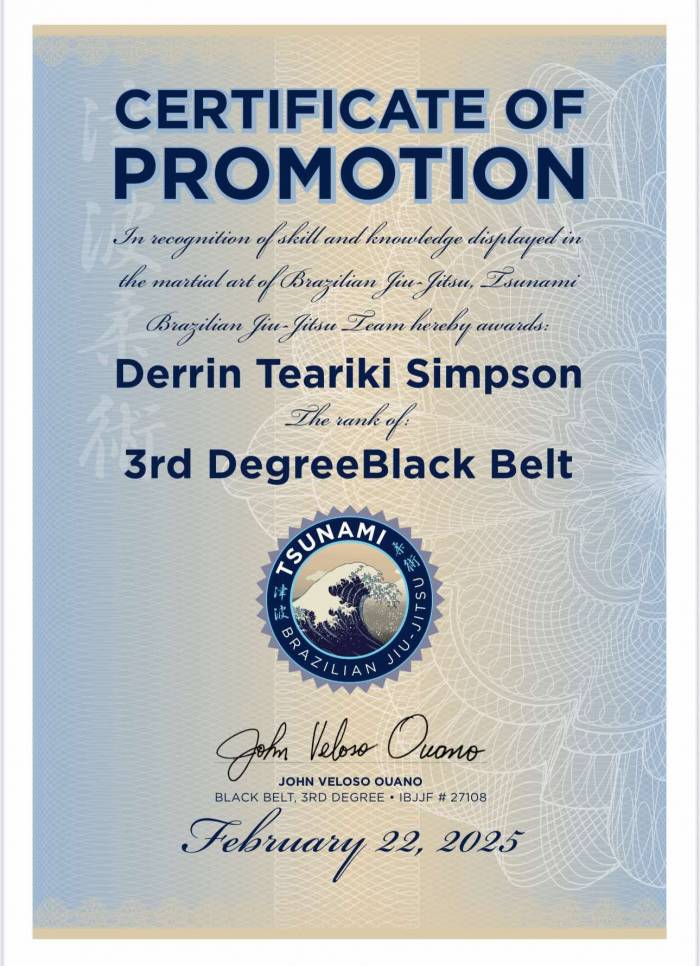 Appreciate the convo brother… Sam trained with me from white belt… Southern Tribes Aotearoa was founded by me & Carl Moke so our signatures are on all certificates. We Joined Tsunami 2018. John gave us our 1st Degrees then. John gave his blessing to grade Sam(& others) as we were on our 2nd lockdown & he couldn’t come here.