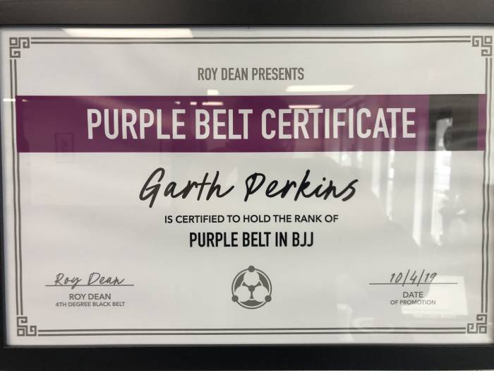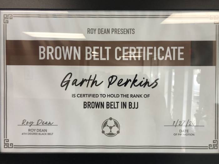 "Jan 2024 brown belt verified by Roy Dean, who is also verified by me."
